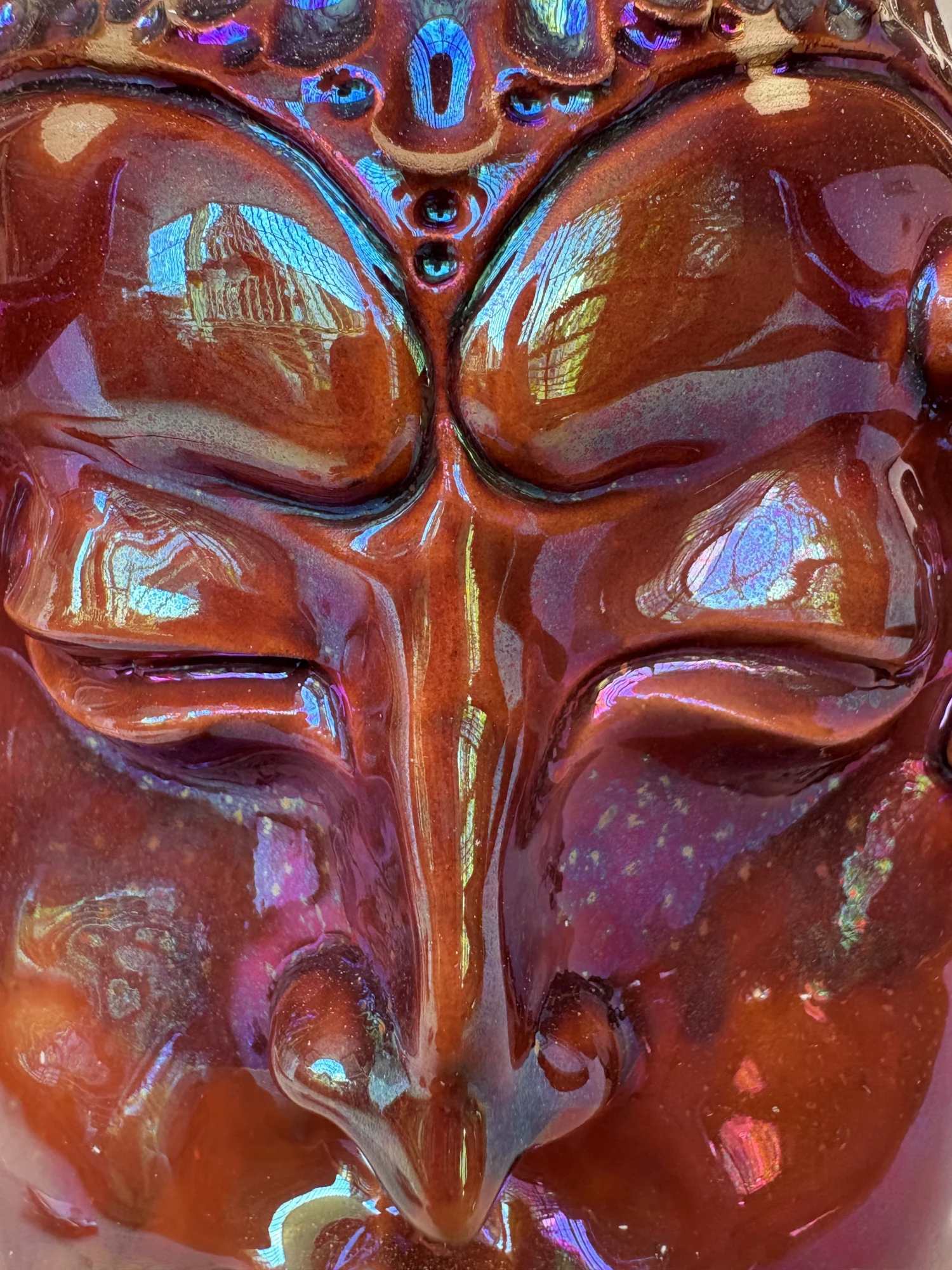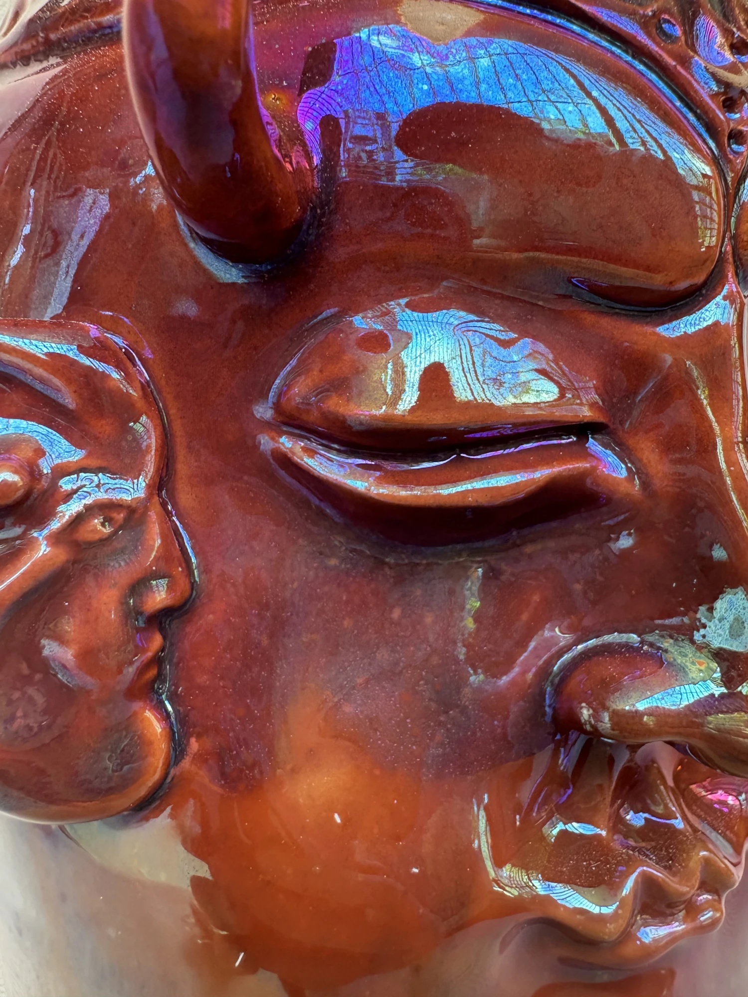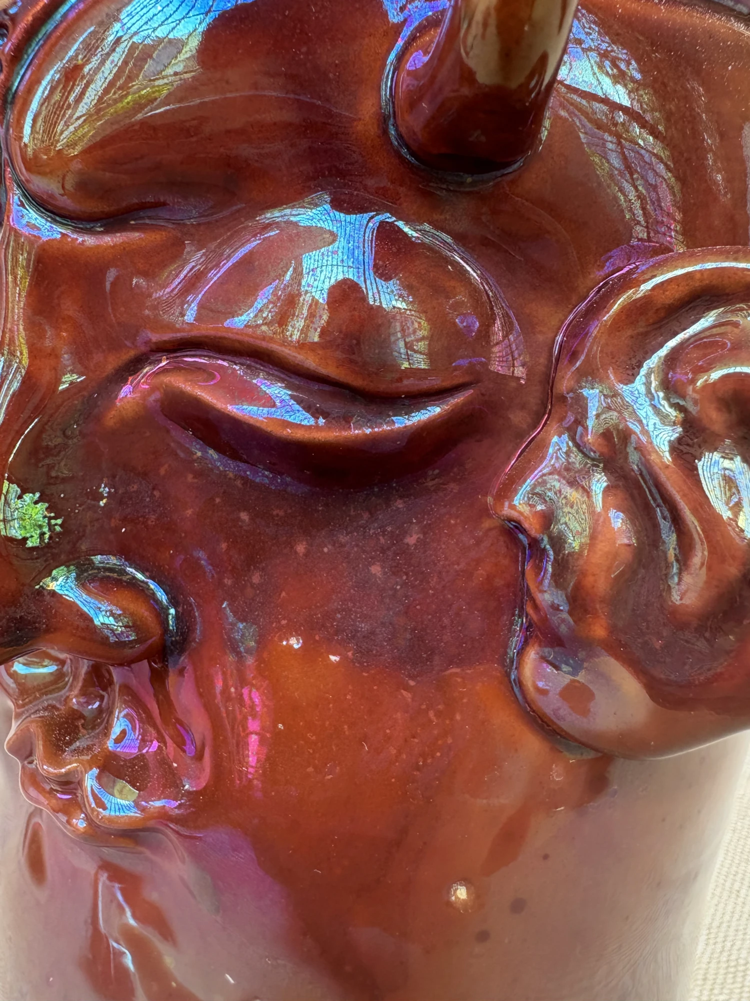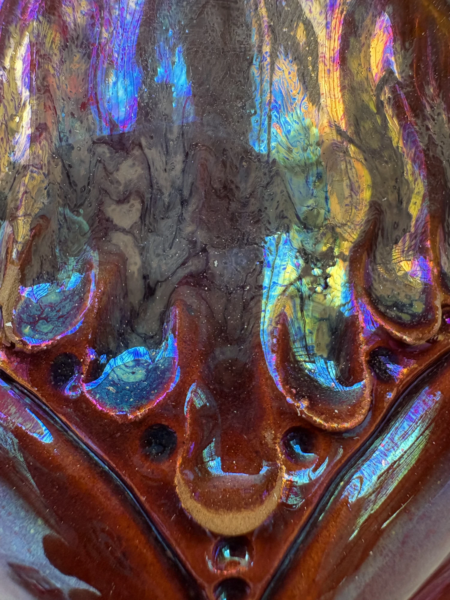 This piece was fired in a reduction atmosphere, where the flame strips oxygen from the kiln and leaves behind unpredictable, often magical results.